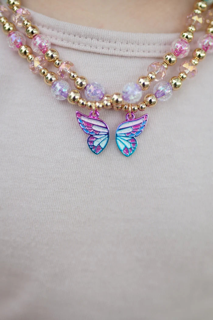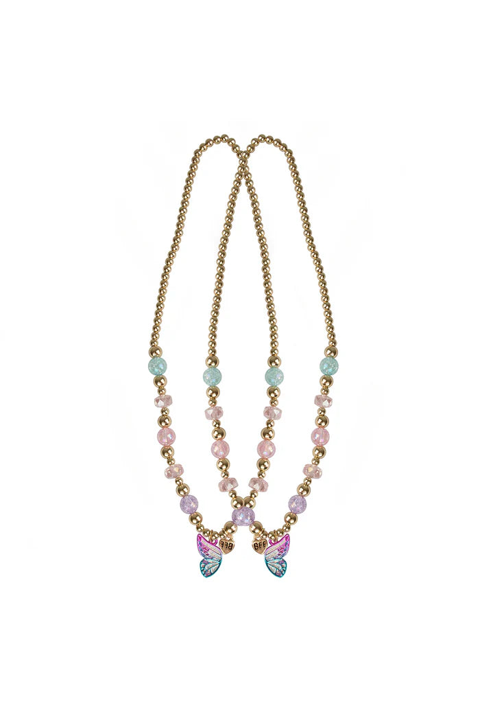 Share the love with your bestie with our Butterfly Wishes BFF necklaces! This set includes two gold toned beaded necklaces, with half a butterfly pendant with a gold BFF heart on each. Our children's jewelry is strung with double the elastic to add extra durability.