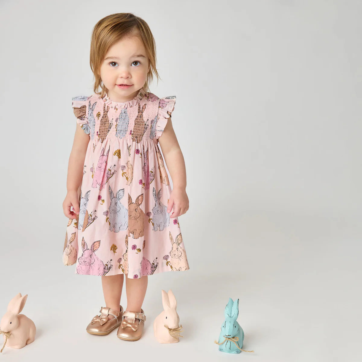 Hop into Easter in style with this charming Stevie Dress Set from Pink Chicken! Crafted in soft 100% cotton poplin, the dress showcases an adorable vintage bunny print that's perfect for spring celebrations. The set includes a coordinating diaper cover topped with a delicate satin bow.