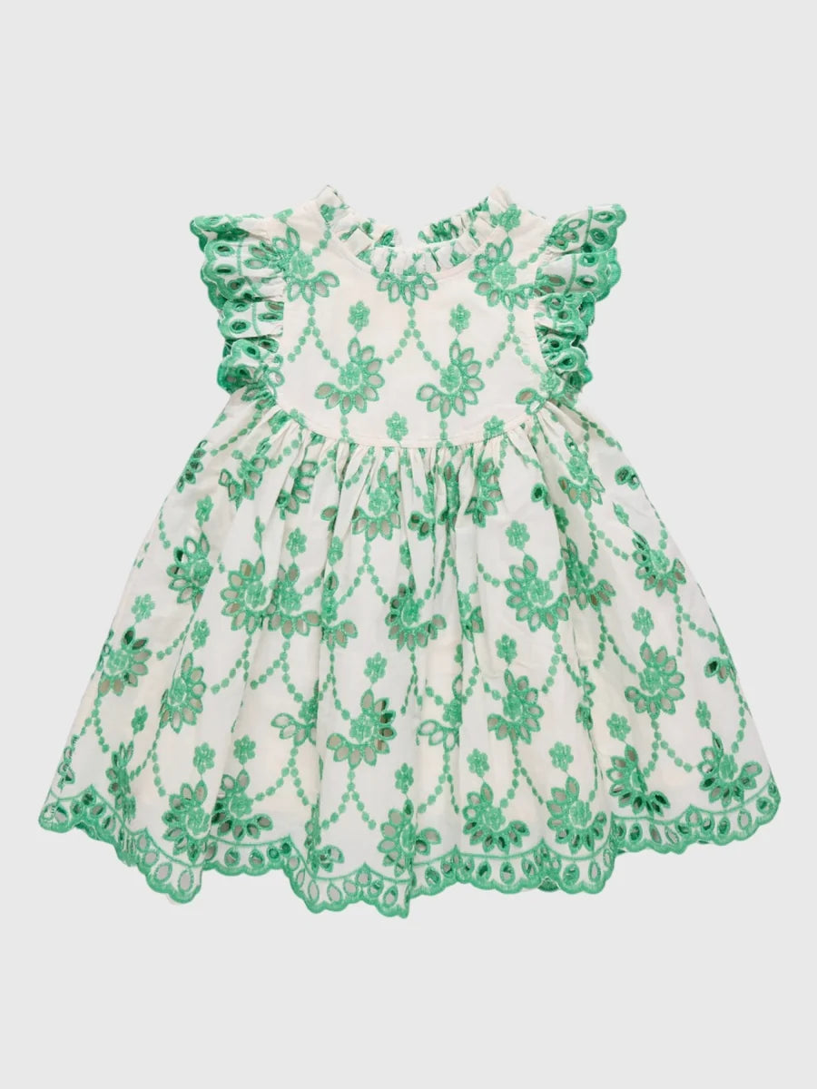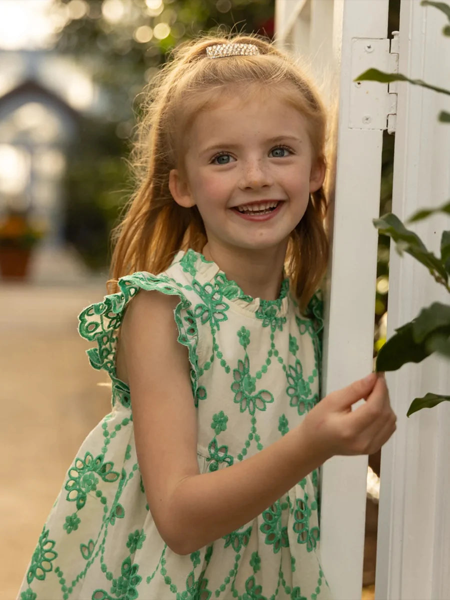 A beautifully detailed dress designed with classic craftsmanship in mind! This fully lined style features intricate green eyelet embroidery throughout, complemented by a scalloped embroidered hem and sleeves. A soft ruffle neckline adds a romantic finishing touch, making this dress perfect for spring gatherings, celebrations, and picture-ready moments.