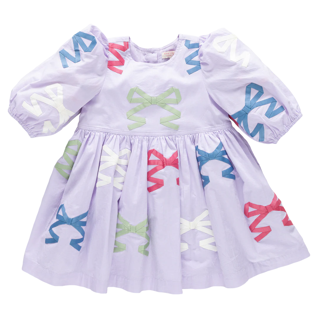 A joyful dress made for twirling, celebrating, and standing out! This charming silhouette is adorned with colorful grosgrain ribbon bow appliqués throughout, creating a playful, dimensional look. Finished with silver glitter buttons down the front, this dress balances fun detail with classic construction for a look that feels festive yet timeless.