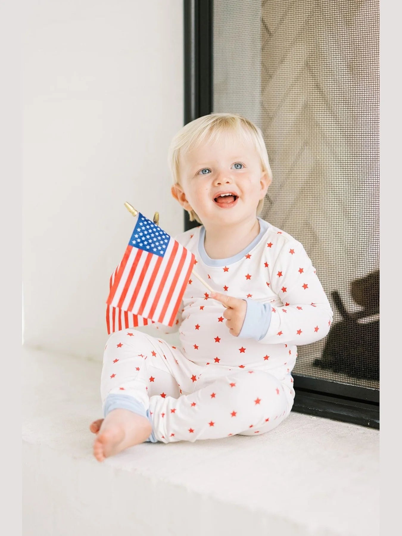 Cozy, playful, and made for sweet dreams, these star pajamas are a bedtime favorite for little ones. The soft two piece set features a long sleeve top and matching pants covered in a cheerful star print that feels fun without being over the top. Gentle cuffs at the wrists and ankles help keep everything comfortably in place for sleeping, lounging, and early morning play.