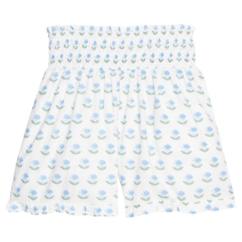 Shirred Ruffle Shorts - Blue Tulip Block Print