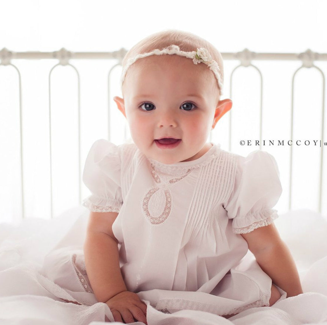 Need that perfect dress for a special occasion, holiday, or just because it's spring? Meet this classy and sweet slip dress, a Feltman Brothers favorite! French lace trims the neck, cuffs, and hem, and is inlaid along with dainty hand embroidery on the bodice and skirt of the dress. Tiny hand stitched pintucks open into sharp pleats down the front for an elegant and sophisticated look. The Lace Ribbon Slip Dress - for when your little one needs to be dressed her best!