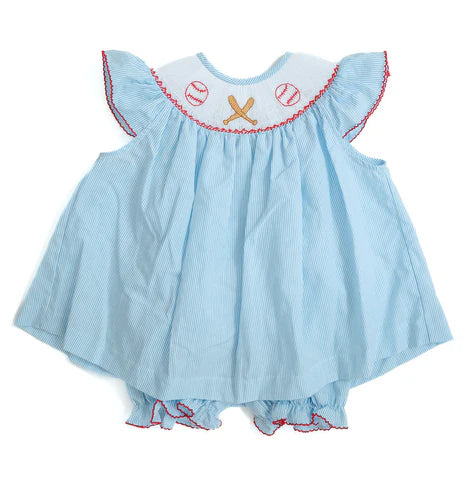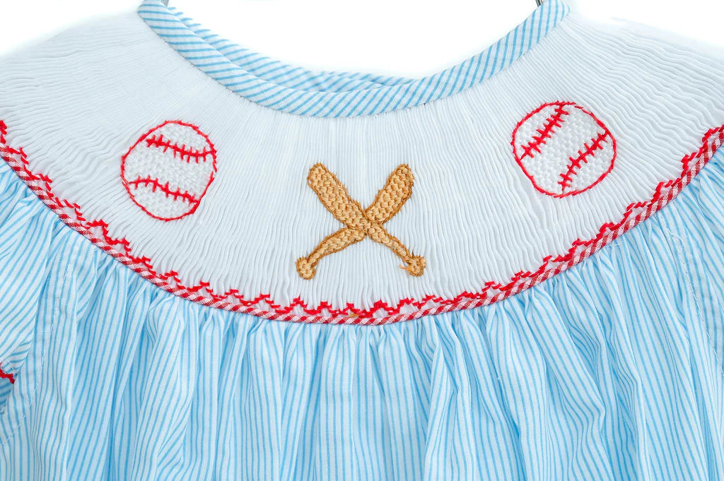 The Smocked Baseball Bloomer Set is an heirloom-quality favorite for little ones ready to cheer on their favorite team in timeless style. Made from a soft 65% Polyester / 35% Cotton blend, this set features a classic blue pinstripe fabric accented with red picot edging and hand-smocked baseballs and baseball bats. It’s perfect for game days, spring ball season, and celebrating America’s favorite pastime.